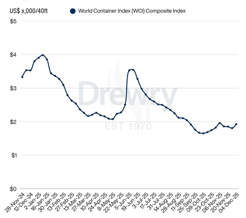 - Drewry世界集装箱运价指数WCI本周止跌反弹7%