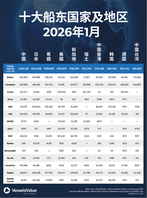 - 按资产价值排名:2026年十大船东国家及地区
