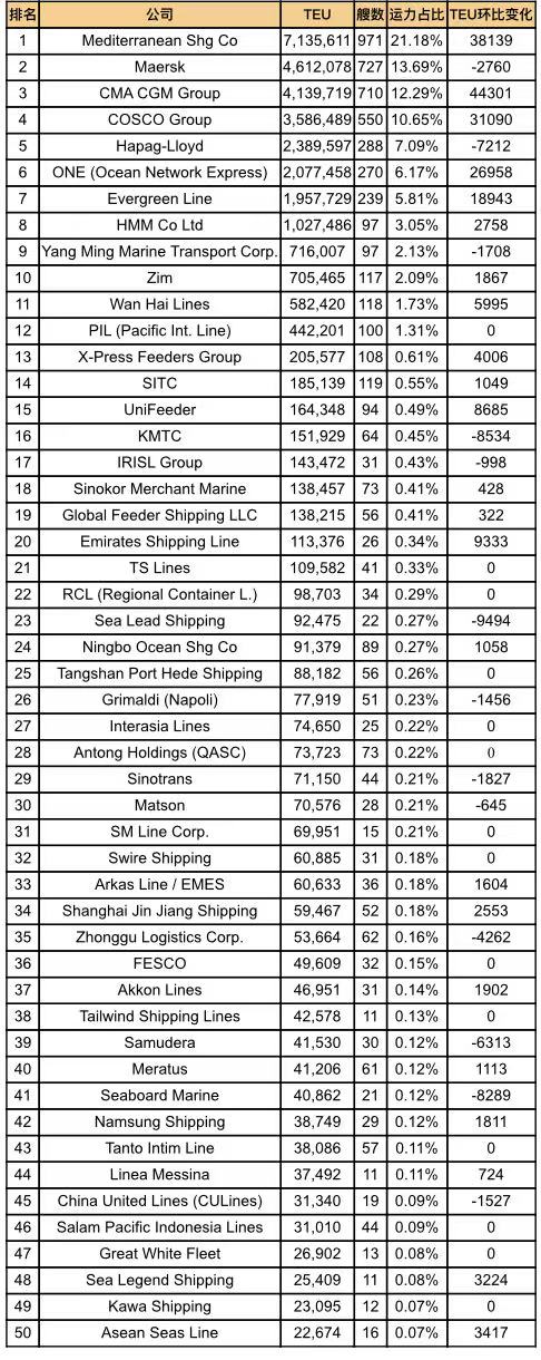 - 全球班轮公司运力百强最新排名(2026年1月)