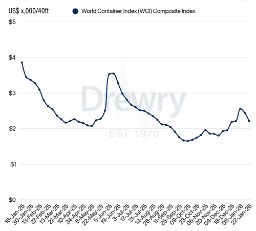 - Drewry世界集装箱运价指数WCI本周下跌10%