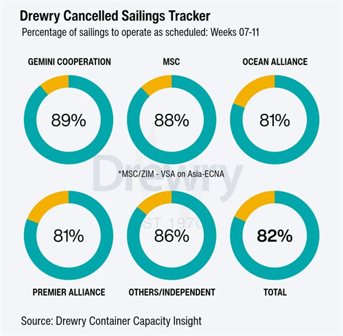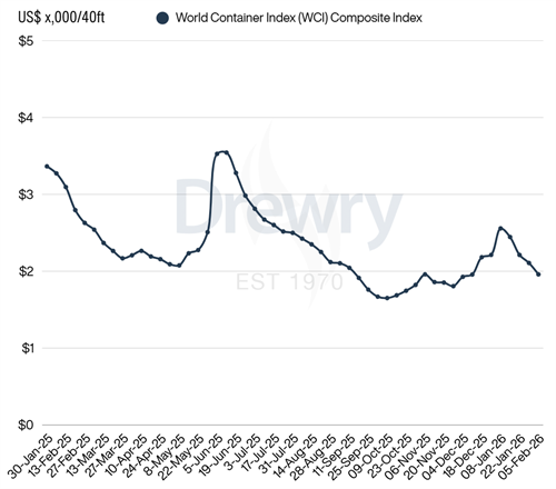 - Drewry世界集装箱运价指数WCI本周下跌7%
