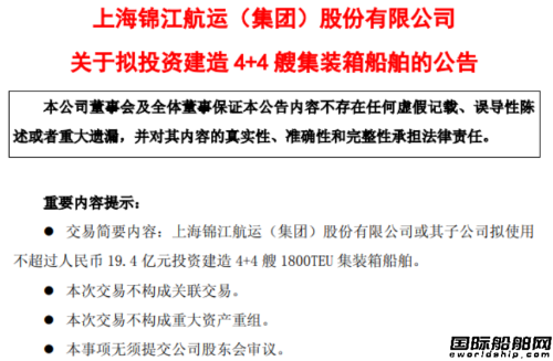 - 8艘超19亿!锦江航运拟增订集装箱船
