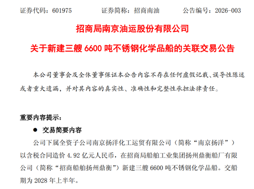 - 3艘近5亿!招商南油订造不锈钢化学品船